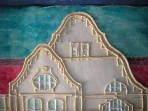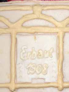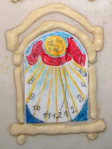 Die Sonnenuhr, das "Erbaut"-Schild sowie das Plakat habe ich vorher einzeln hergestellt. Diese Teile werden nun noch auf den Kuchen "geklebt", und somit ist er fertig! |
